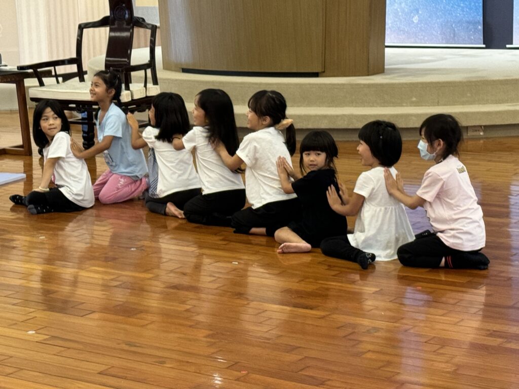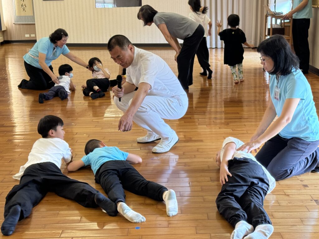 而後大愛光老師帶靈性功法⸻滾地,細節是要平穩直線的滾到另一邊,而孩子們迫不及待地滾動身體,有人急、有人緩、有人滾歪。接著兩人一起滾,或是三人一起滾,有些孩子輕鬆無事,有些孩子出現頭暈現象。大愛光老師讓孩子們休息一下,以及大愛手的服務減緩不舒服狀況。