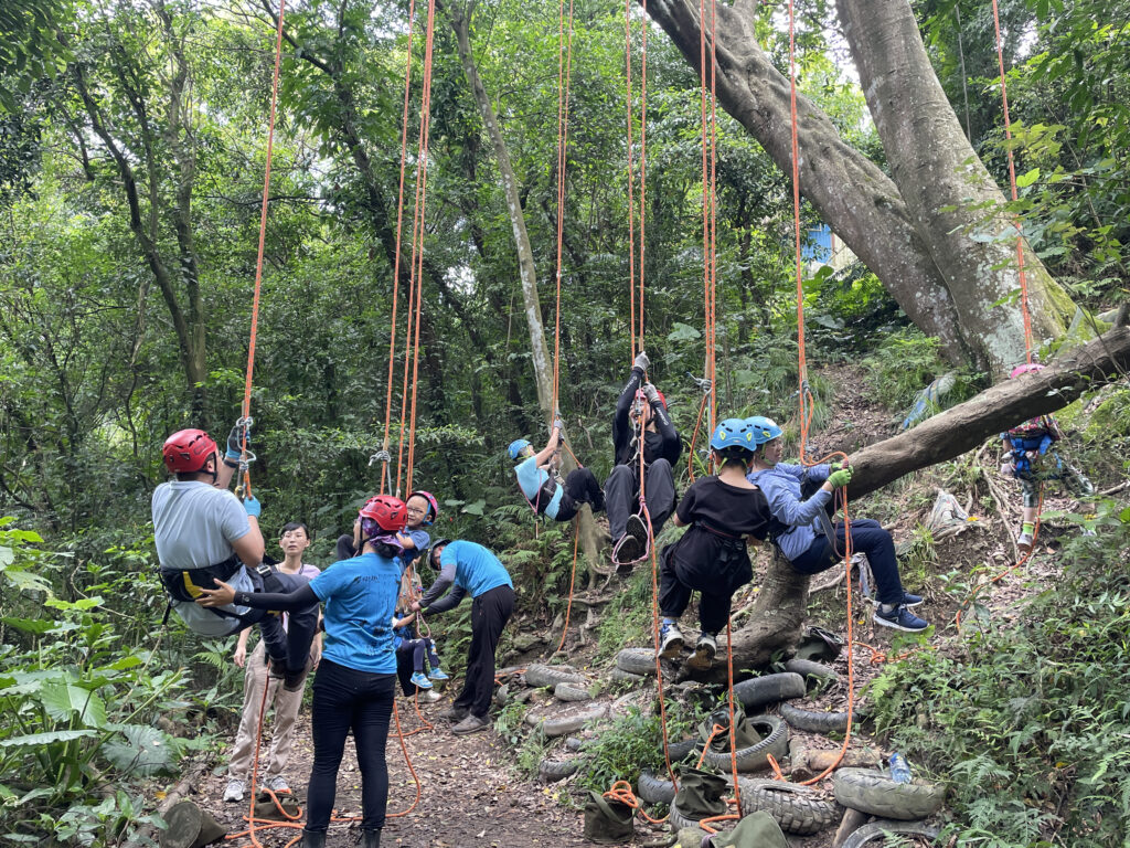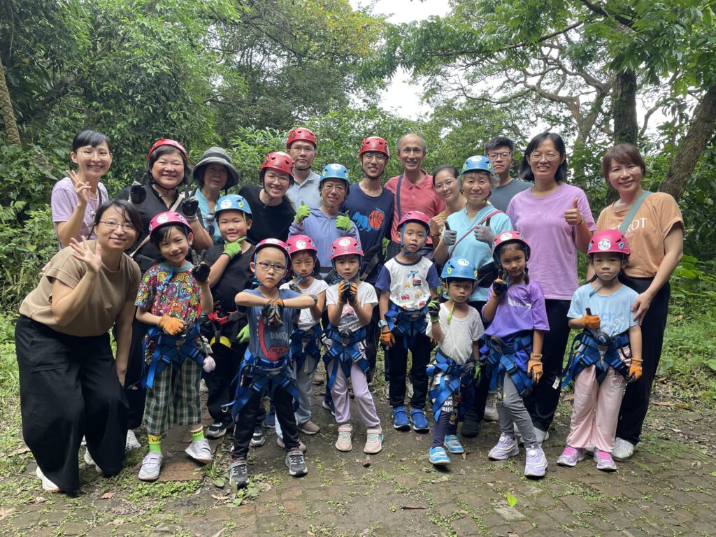 孩子們仔細聆聽攀樹教練的說明後,穿上安全防護裝備,扣緊繩索,一步步往上攀爬時,從開始的擔心、害怕,到後來全神貫注地挑戰自我,到最後也鼓勵爸爸媽媽一起攀樹,體會過程中的不安、努力、信心、毅力、勇氣。