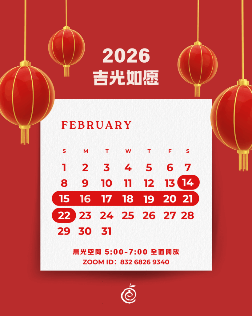 春節期間 2/14 (六)-2/22 (日),晨光空間 5:00-7:00 全面開放,免報名,敬邀家人朋友一同上線,補給滿滿能量 😍
