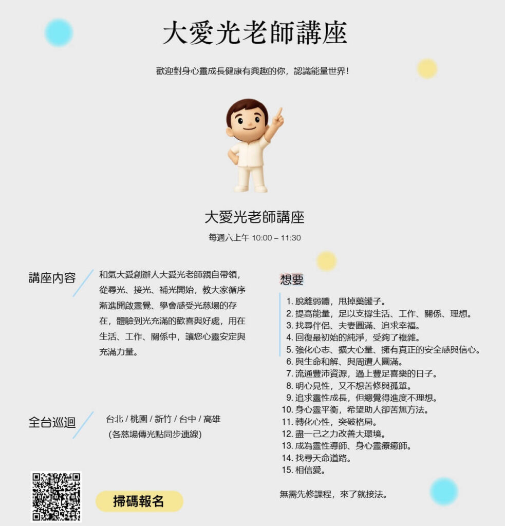 和氣大愛創辦人大愛光老師,親自帶你從尋光開始,一步步學會接光、補光,就像給心靈充電,每天都能用得上,生活也跟著亮起來!