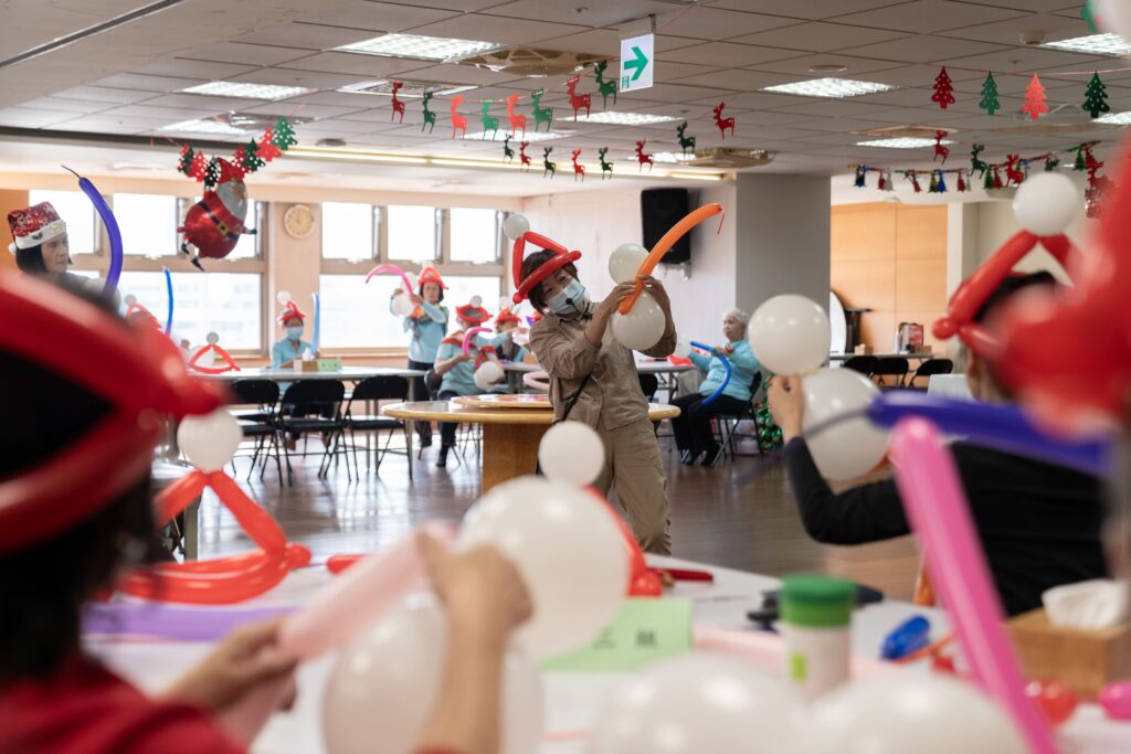 聖誕餐會安排青年團隊與長輩同桌互動,從聖誕飾品DIY、精彩演出,到「傳球傳幸福、銀髮活力遊戲」,現場氣氛溫馨熱鬧。長輩專注動手、笑聲連連,精神抖擻;青年全程細心陪伴,讓長輩保持創意、活力與笑容。